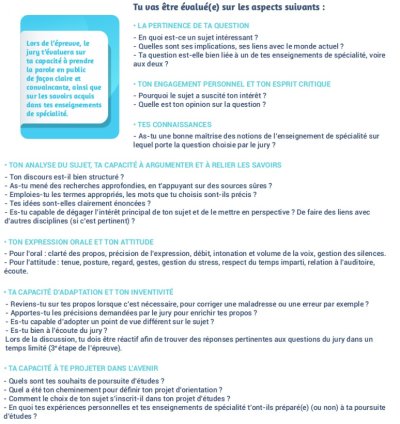L’épreuve permet au candidat de montrer sa capacité à prendre la parole en public de façon claire et convaincante. Elle lui permet aussi de mettre les savoirs qu’il a acquis, particulièrement dans ses enseignements de spécialité.