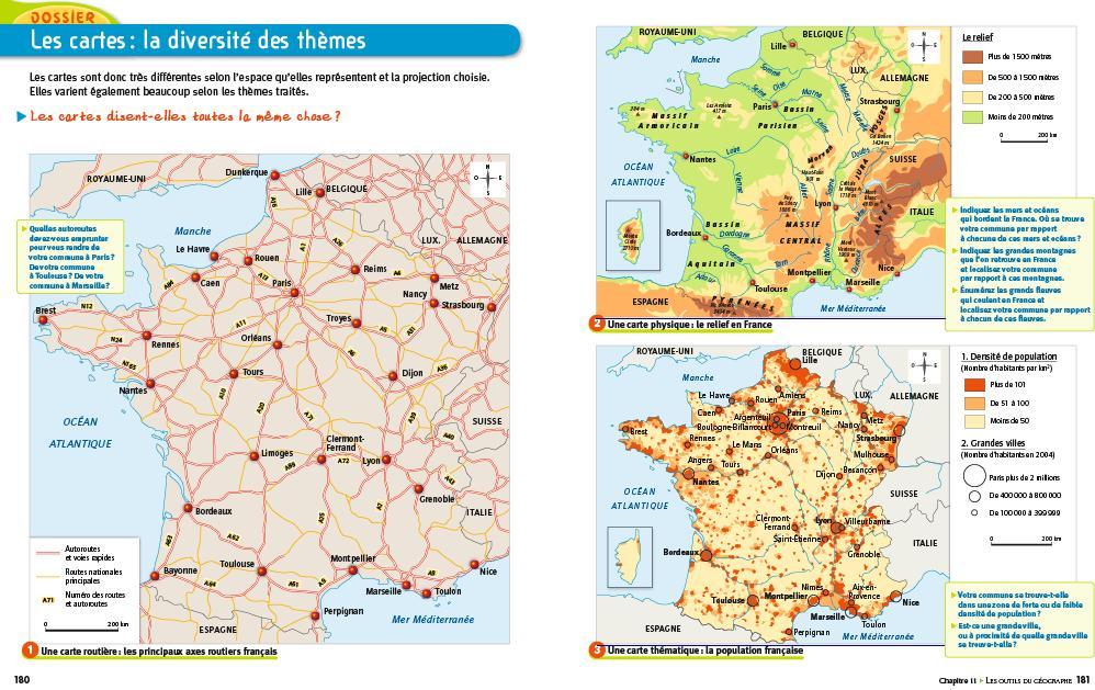 – Les cartes sont des outils indispensables en géographie. Elles sont généralement orientées au Nord. Il faut être très attentif au titre et à la légende qui donnent le thème (relief, population, voies de communication, frontières...).